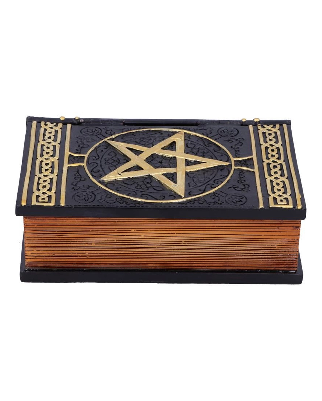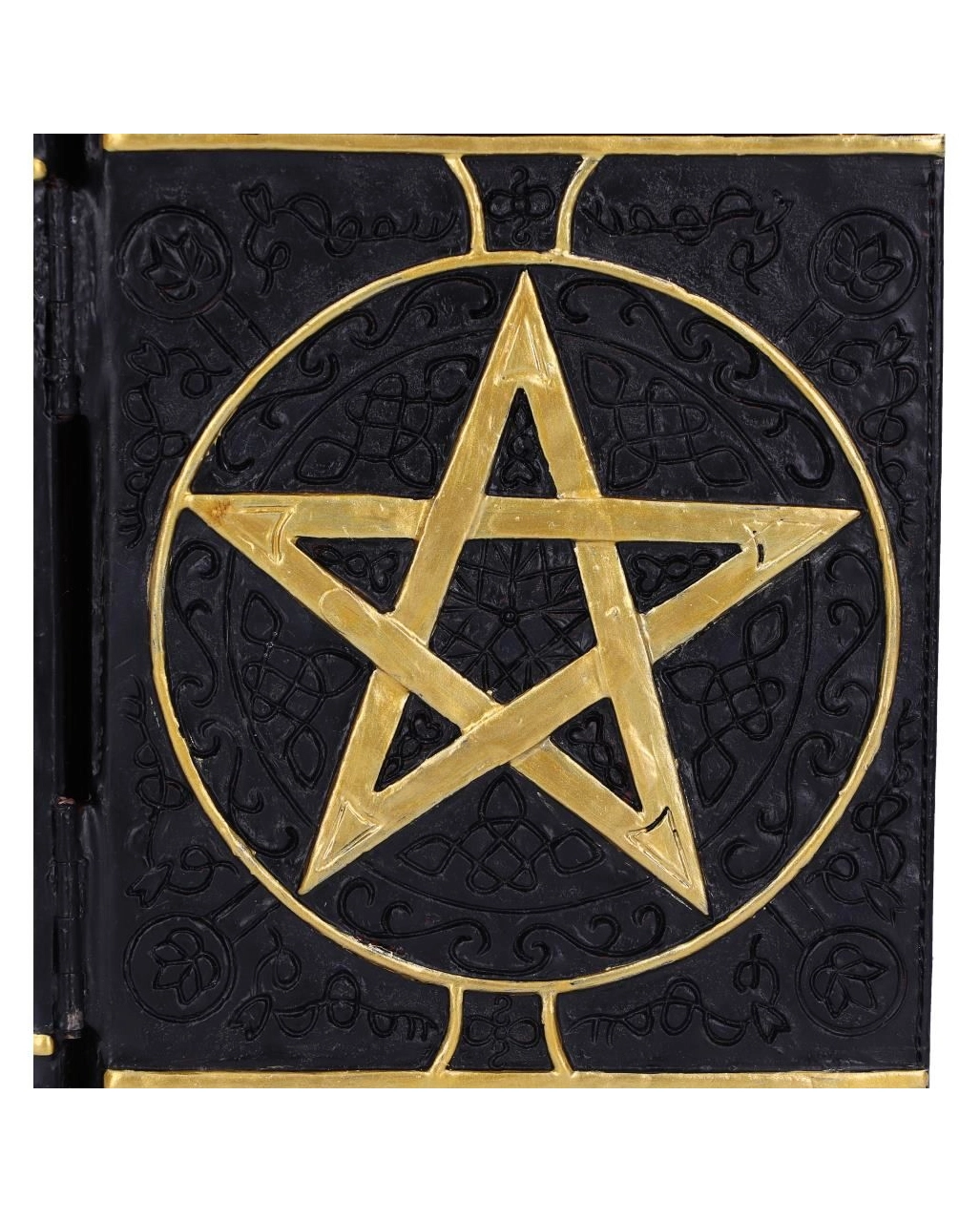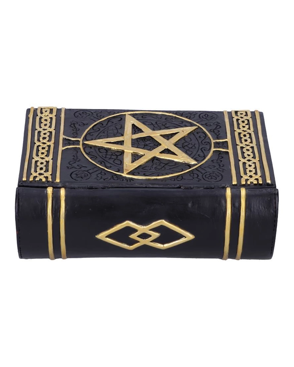 Natürlich ist die schwarzes Buch Magischer Sprüche Schmuckschatulle auch eine fantastische Geschenkidee für eine Hexenfreundin. Sie wird sich sicher freuen über dieses besondere Stück edler Gothic Homeware. Diese düstere Gothic Schatulle kommt schließlich in Form eines antiken Buches, das hochwertig gebunden erscheint, daher. Ein erhabenes goldenes Pentagramm ist auf den Deckel der Zauberbuch-Schatulle gedruckt. Detaillierte Muster verzieren den Deckel oben und unten.